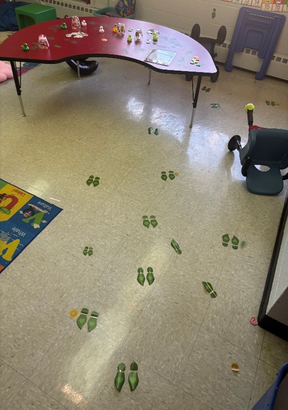 The next day, after returning from specials, students entered the classroom and discovered that a leprechaun had visited while they were away. The classroom environment appeared changed, with desks and chairs moved, leprechaun footprints on the floor, and glitter, gold coins, and small ducks left behind on the tables. The traps students created were still on the tables, suggesting that the leprechaun managed to escape. A letter from the leprechaun was also left for the class.