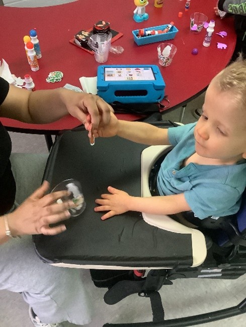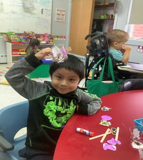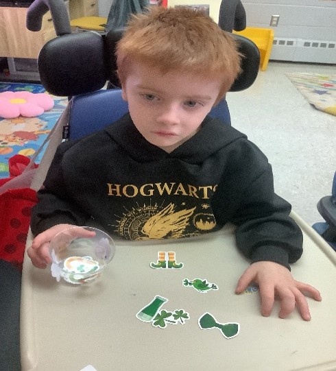 After the story and discussion, students were asked if they would like to try creating their own leprechaun traps in case a leprechaun decided to visit our classroom. Students decorated plastic cups using stickers and other craft materials to design their traps. This activity encouraged creativity while also supporting fine motor development as students practiced grasping materials, gluing, placing stickers, and decorating their traps. Students also practiced following one-step directions and participating in a structured classroom activity.