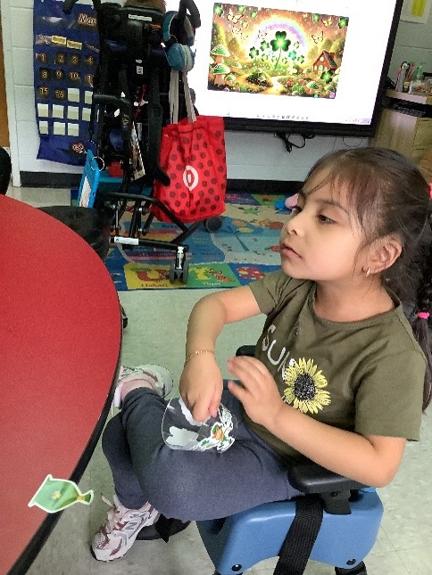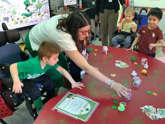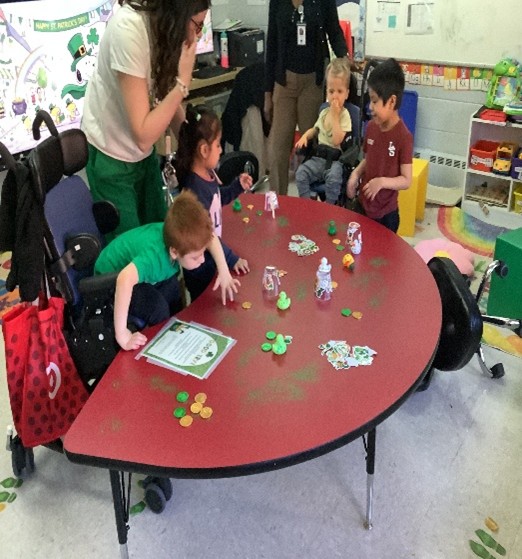 To further support engagement and participation, students listened to the song “I’m a Little Leprechaun” and practiced following directions while participating in a group activity. Music and movement activities help students build listening skills, attention, and participation within a group setting.