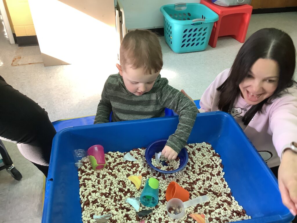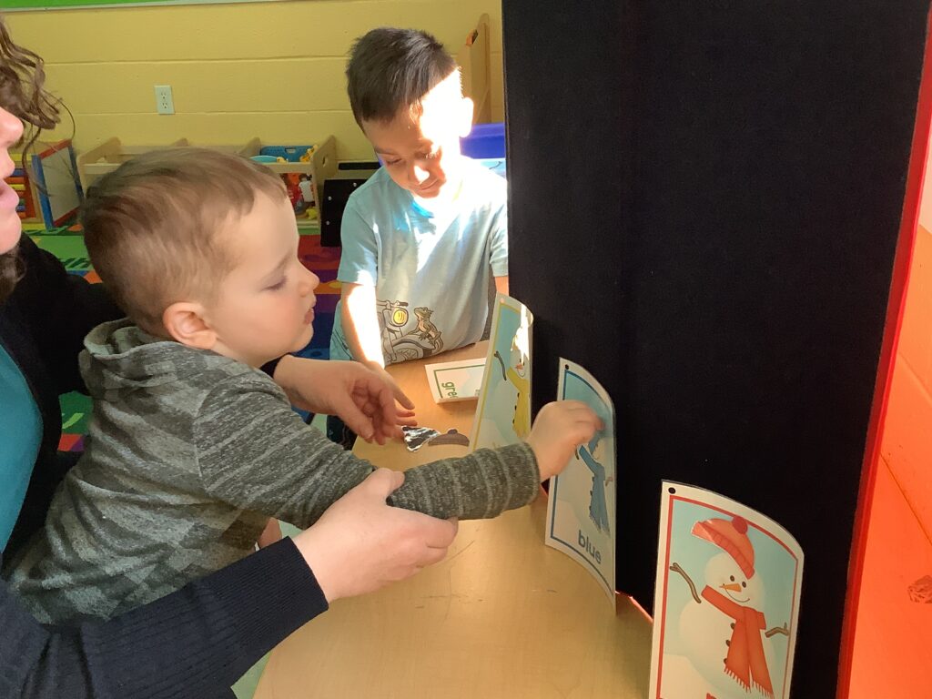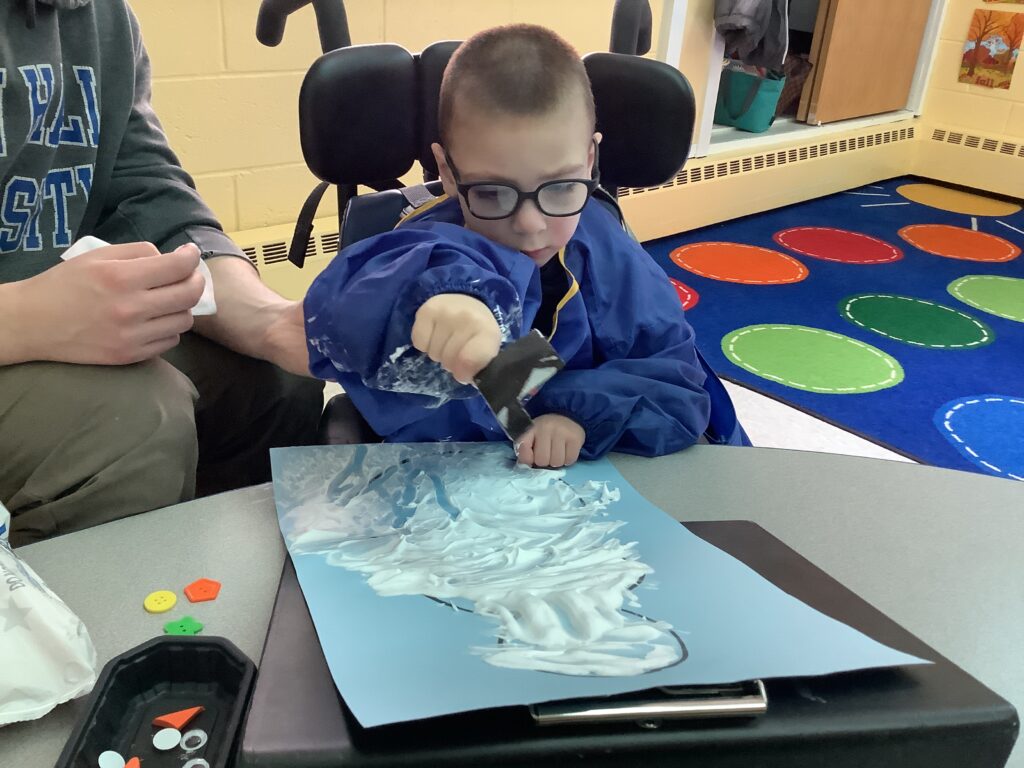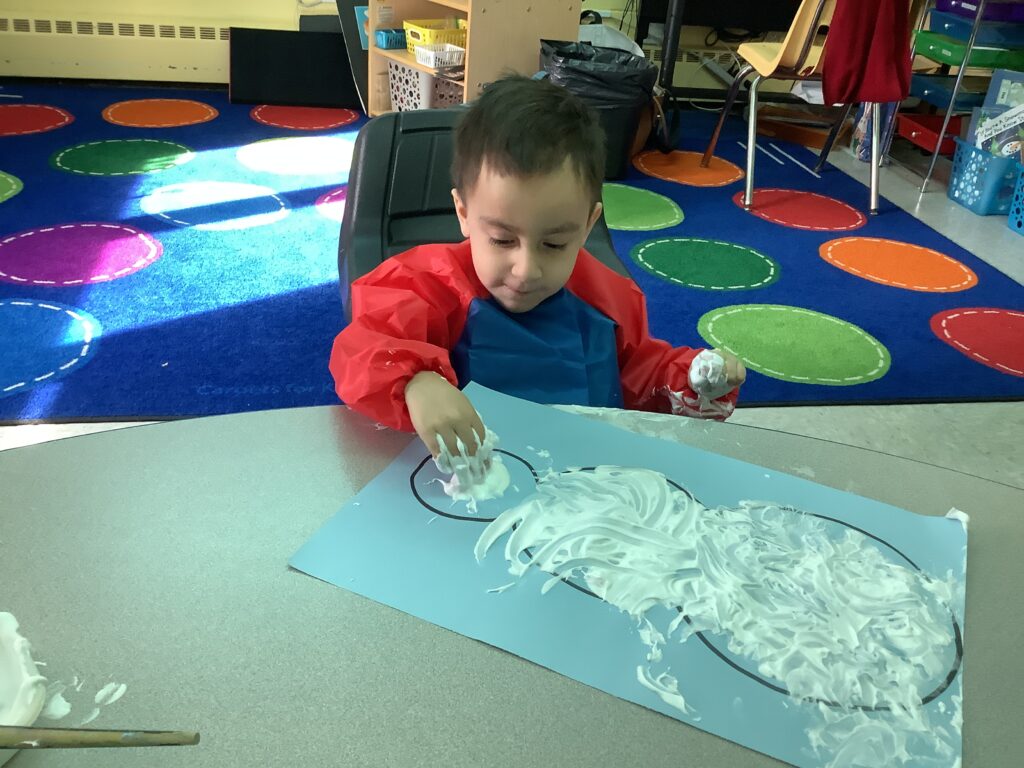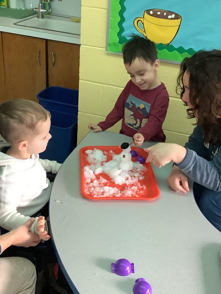 In our classroom, students love sensory-based learning. Gabriel and Bradan worked on color identification by matching colored hats to the correct snowman. Later in the week, the class enjoyed a sensory activity, finger painting with a mix of shaving cream and glue to create “fluffy” snowmen. Before painting, students used tabletop mirrors to identify their own facial features- head, eyes, nose, and mouth, which they then recreated on their art pieces using scarves, hats, and buttons. Luca loved getting messy with this activity. Finally we brought the snow inside! Students explored real snow with and without mittens and even practiced building snowmen right at the table. We had “snow” much fun learning in preschool 212 this week!