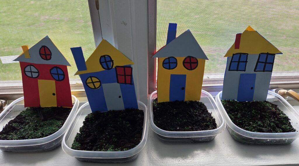 To make our project even more exciting, we added a science element by placing each house into soil and planting grass seed around it. Students learned that, just like in real life, homes can be surrounded by growing, living landscapes. We talked about what plants need to grow—sunlight, water, and time—and how we will care for our “lawns” in the coming days.